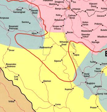 | You will not find Mrkonjic Grad on this post-Dayton map of ethnically partitioned and NATO occupied Bosnia. Mrkonjic Grad is slightly north of Sipovo - at the place where "anvil" is most narrow. If it was on the map it would be round letter "U" in "UK Sector". |