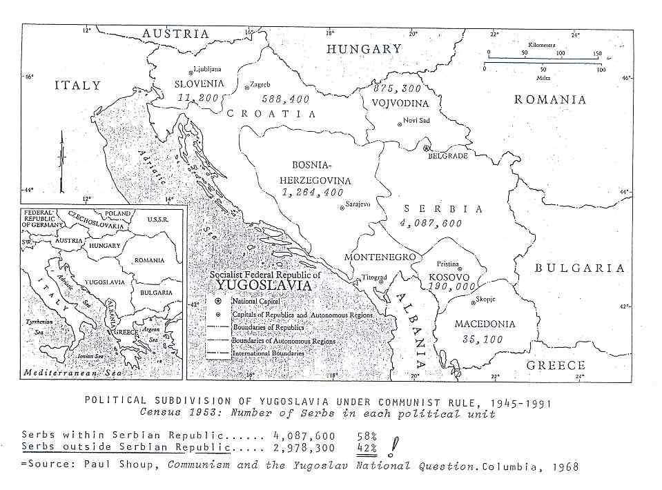 The following map was referenced in: "Communism and the Yugoslav National Question" by Paul Shoup, Columbia, 1968. The text associated with the map: Political subdivision under Communist rule, 1945-... Census 1953: Number of Serbs in each political unit.
