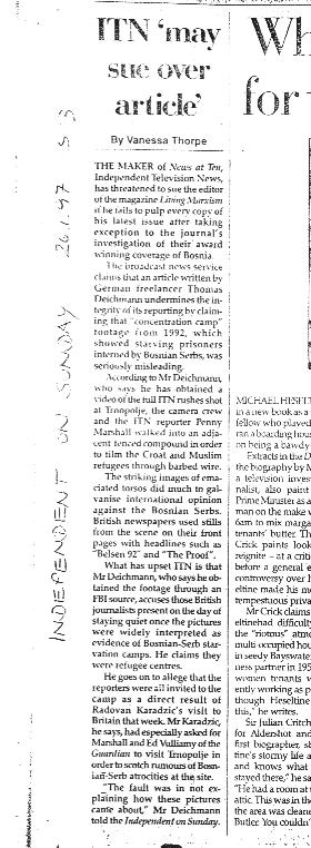 Independent on Sunday, 26 January 1997 ITN 'may sue over article' By Vanessa Thorpe THE MAKER of News at Ten, Independent Television News, has threatend to sue the editor of the magazine Living Marxism if he fails to pulp every copy of his latest issue after taking exception to the journal's investigation of their award winning coverage of Bosnia. The broadcast news service claims that an article written by German freelancer Thomas Deichmann undermines the integrity of its reporting by claiming that "concentration camp" footage from 1992, which showed starving prisoners interned by Bosnian Serbs, was seriously misleading. According to Mr Deichmann, who says he has obtained a video of the full ITN rushes shot at Trnopolje, the camera crew and the ITN reporter Penny Marshall walked into an adjacent fenced compound in order to film the Croat and Muslim refugees through barbed wire. The striking images of emaciated torsos did much to galvanise international opinion against the Bosnian Serbs. British newspapers used stills from the scene on their front pages with headlines such as "Belsen 92" and "The Proof". What has upset ITN is that Mr Deichmann, who says he obtained the footage through and FBI source, accuses thos British journalists present on the day of staying quiet once the pictures were widely interpreted as evidence of Bosnian-Serb starvation camps. He claims they were refugee centres. He goes on to allege that the reporters were all invited to the camp as a direct result of Radovan Karadzic's visit to Britain that week. Mr Karadzic, he said, had especially asked Marshall and Ed Vulliamy of the Guardian to visit Trnopolje in order to scotch rumours of Bosnian-Serb atrocities at the site. "The was was in not explaining how these pictures came about," Mr Deichmann told the Independent on Sunday.